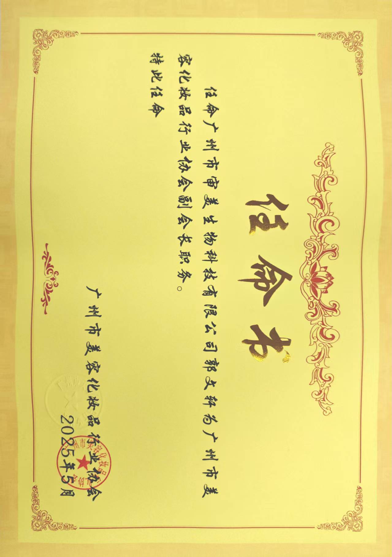 任命广州市审美生物科技有限公司郭文轩为广州市美容化妆品行业协会副会长职务。