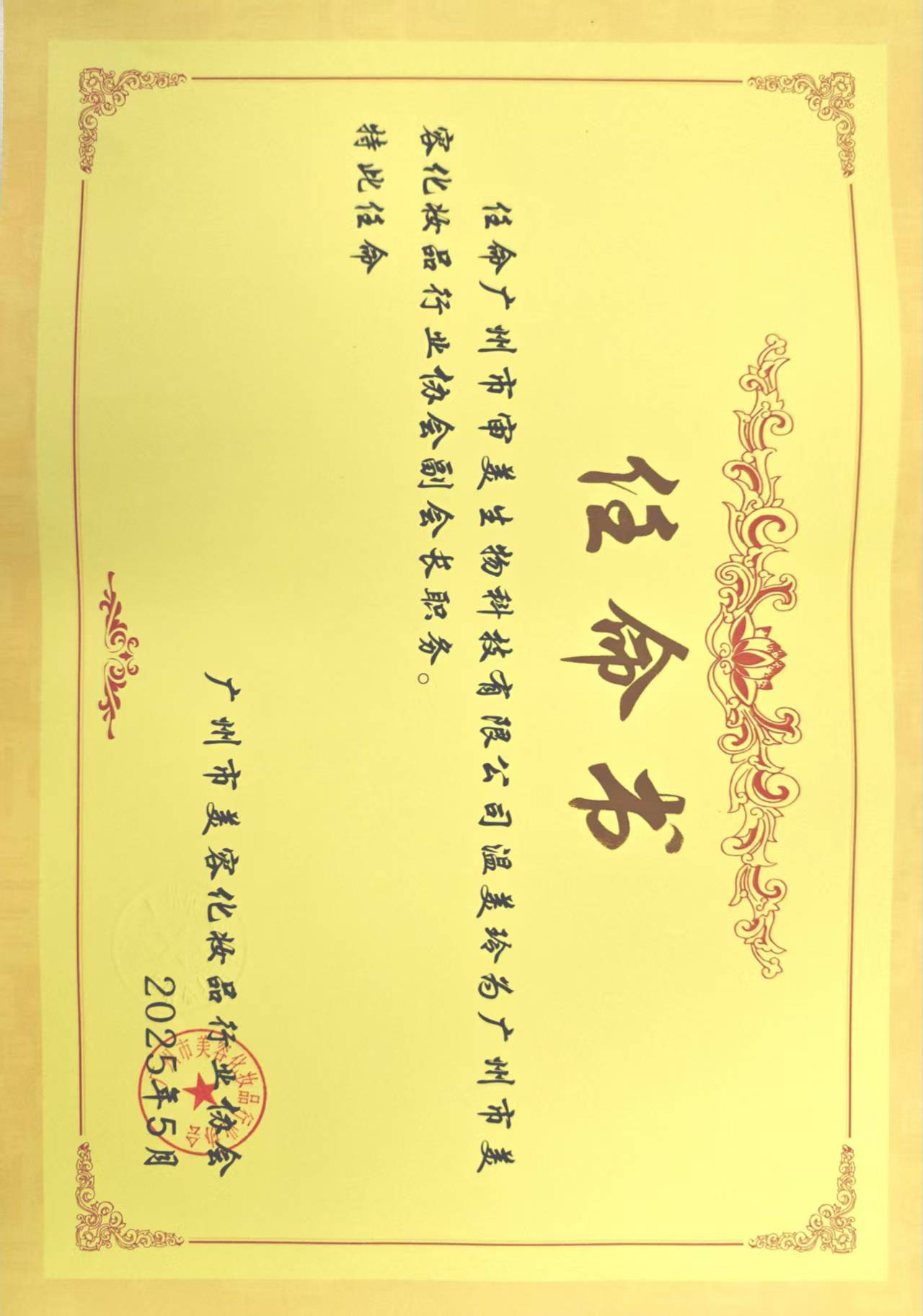 任命广州市审美生物科技有限公司温美玲为广州市美容化妆品行业协会副会长职务。